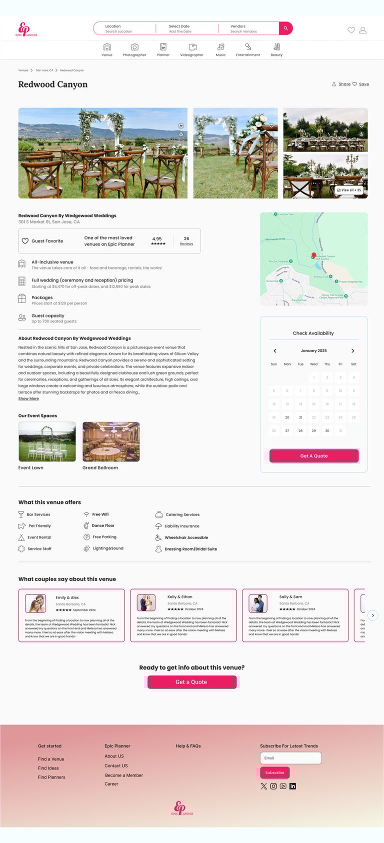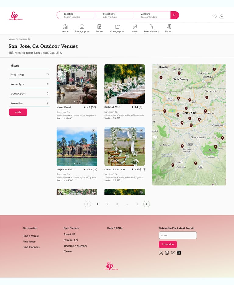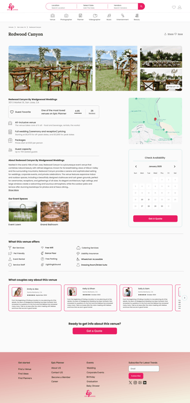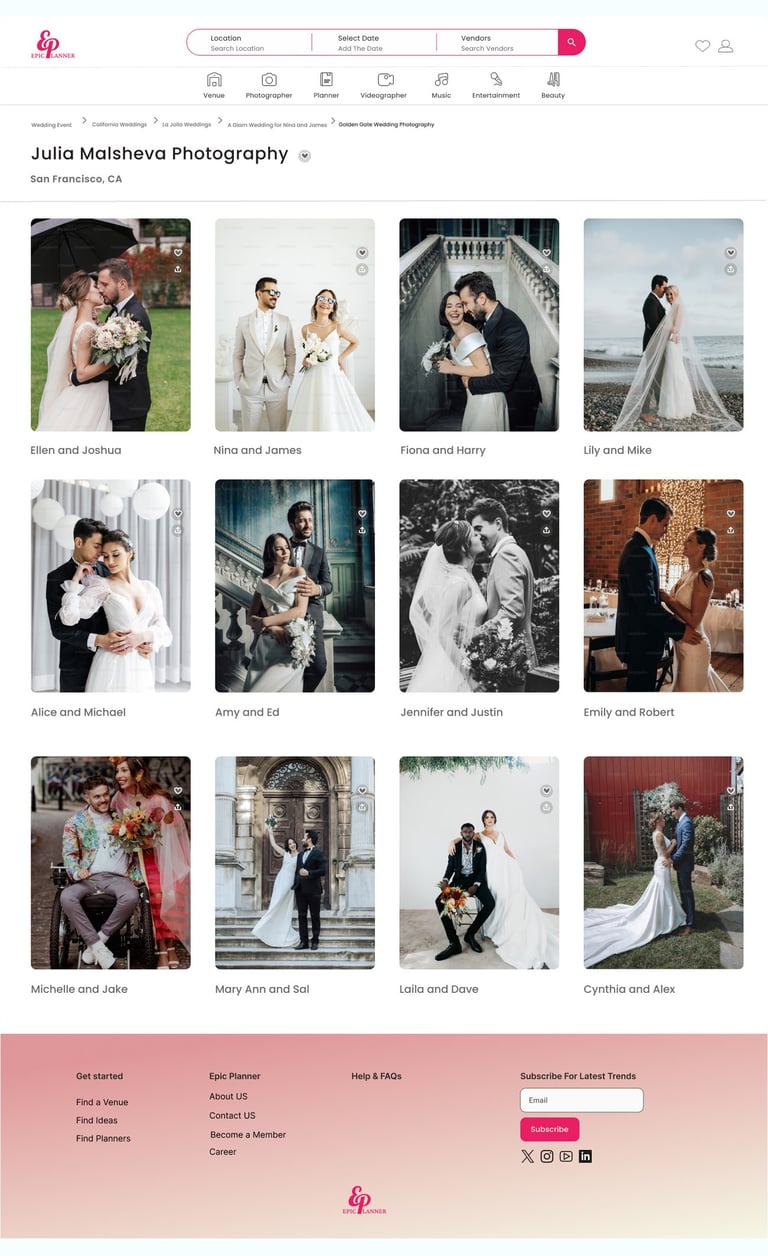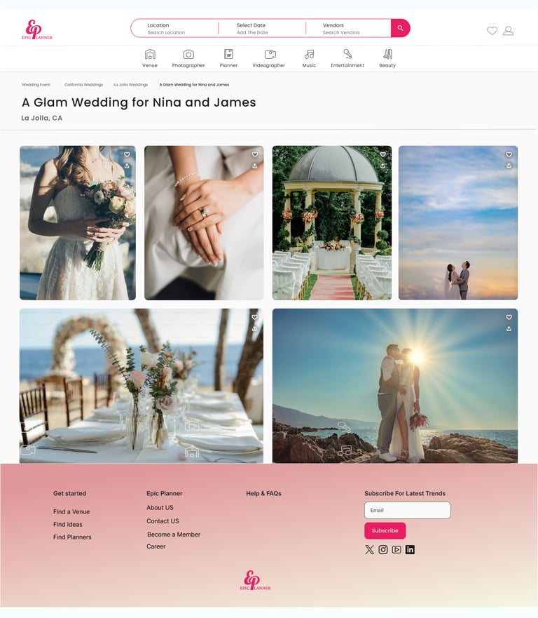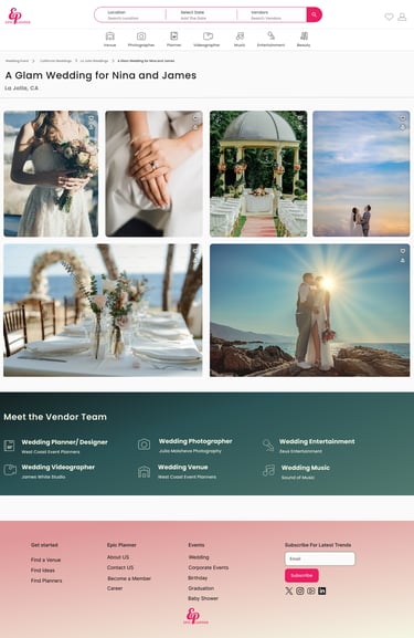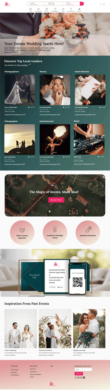 Epic Planner is a wedding planning platform created during a UX/UI bootcamp. This project focused on building an intuitive and user-friendly experience where couples can easily browse, connect with, and book wedding vendors, while vendors can showcase their services and grow their business.
