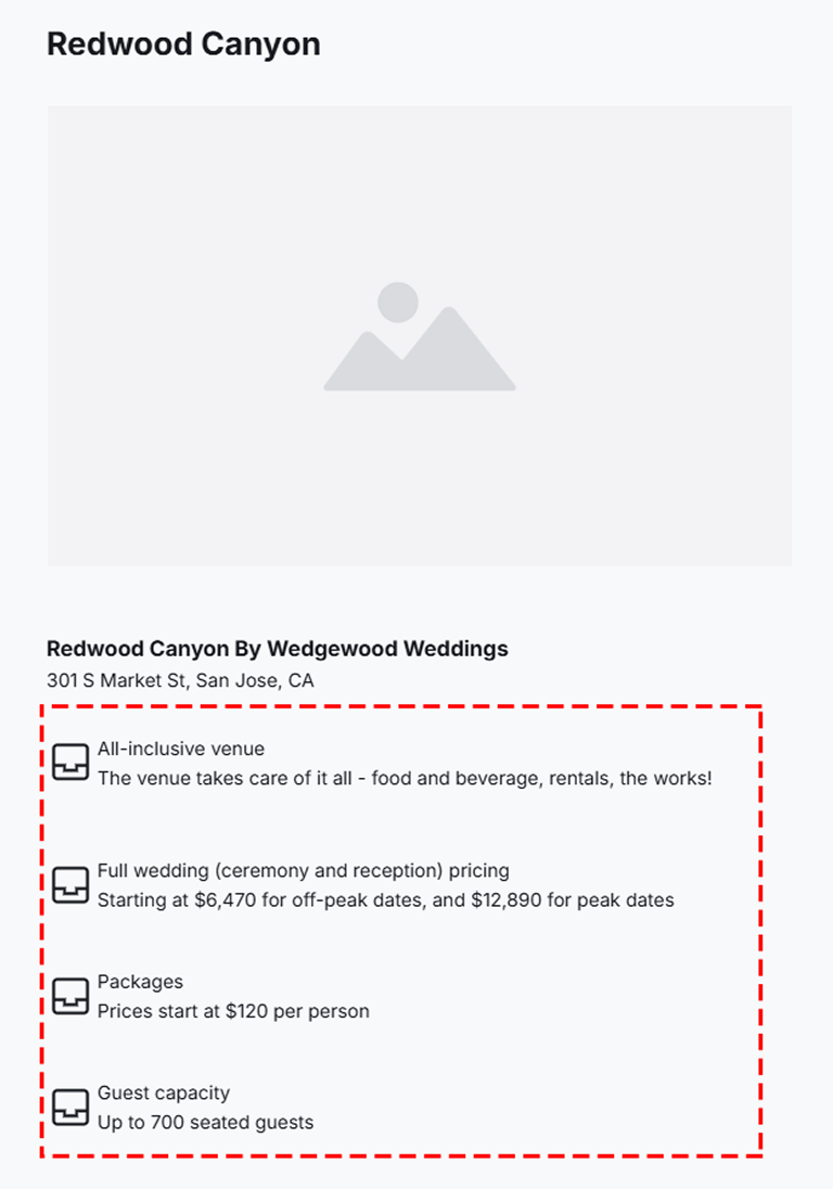 • Transparent Venue Details: Provides users with upfront access to essential details like pricing, guest capacity, and customer ratings, fostering trust and reducing uncertainty in vendor selection.
