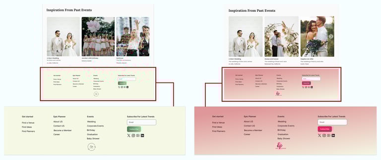 Based on user feedback, we found that the original light green footer lacked sufficient contrast with the rest of the page, making its content difficult to read and visually underwhelming. To improve legibility and create a more engaging visual hierarchy, we updated the footer to light pink, which provides better contrast, draws attention to key links, and enhances the overall aesthetic balance of the page. This change ensures that users can easily scan and interact with footer content, supporting a smoother and more enjoyable browsing experience.