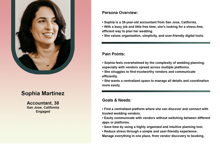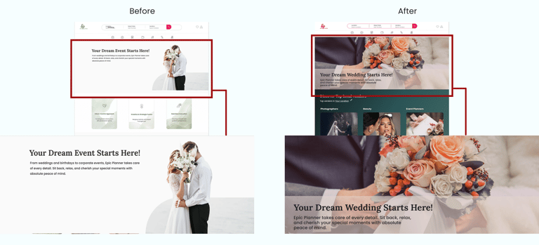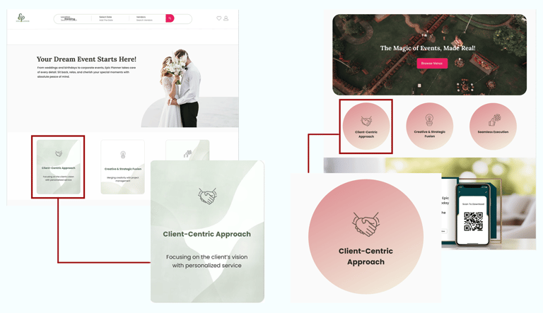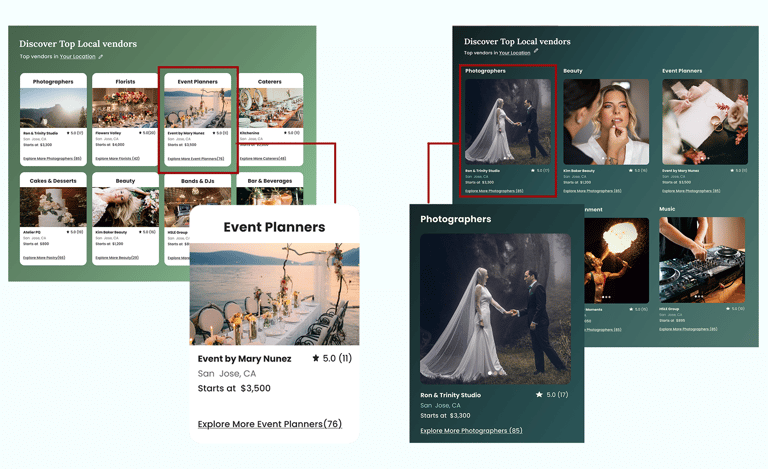 Based on usability testing, qualitative feedback, and visual hierarchy principles, we refined the card layout and color palette to improve readability and support clearer content scanning. Users felt the original colors were too muted and did not convey the joy, excitement, and celebratory atmosphere of a wedding. We introduced brighter, warmer tones to better reflect the emotional context of weddings, enhance visual energy, and create a more engaging first impression.