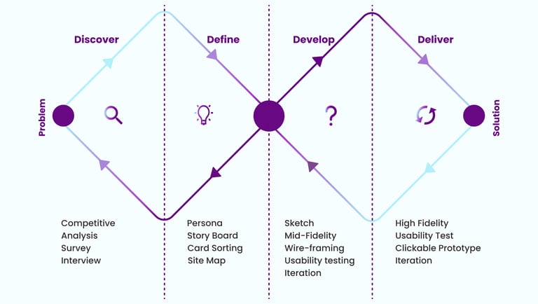 Our team of five utilized the Double Diamond framework, based on the Design Thinking methodology, to shape our process. Instead of adhering to a strictly linear approach, we moved through stages iteratively, continuously refining our solutions as the project progressed.