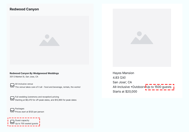 Improved decision-making by surfacing guest capacity information early, displaying capacity ranges directly on listing cards and venue description pages.