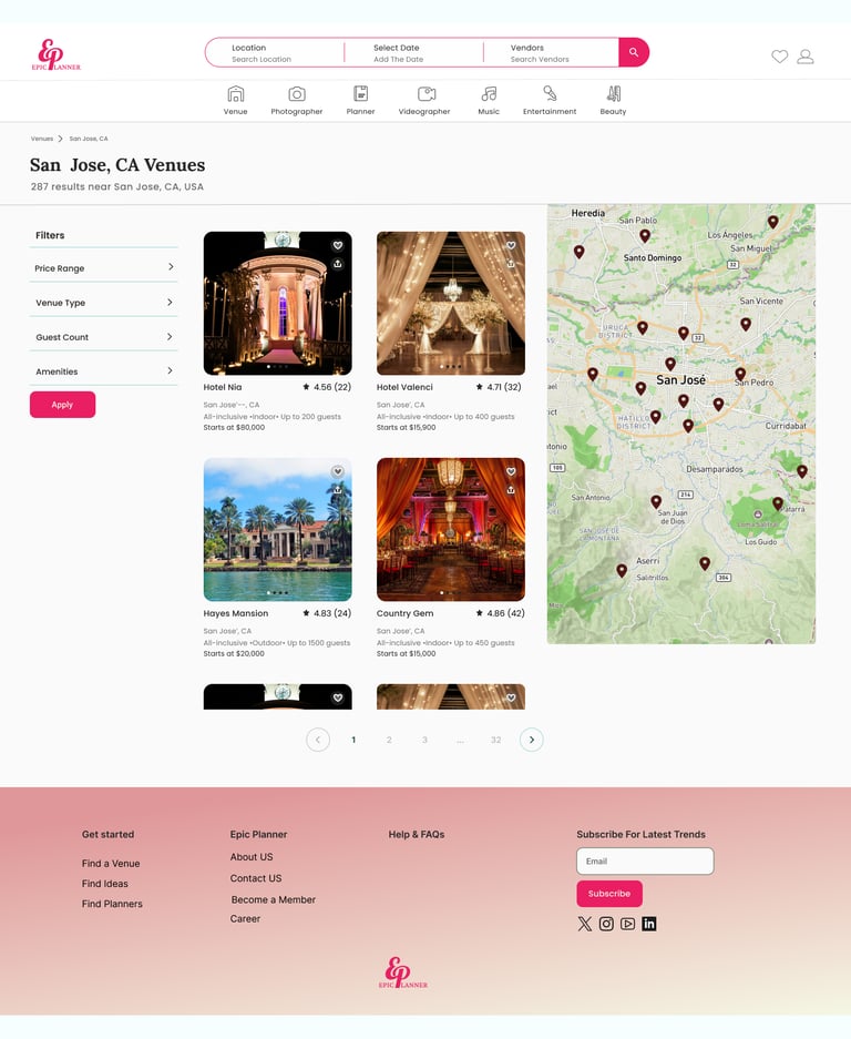 • Advanced Search Functionality: Supports users in narrowing down vendor options by simultaneously filtering based on location and event date, streamlining the search experience.