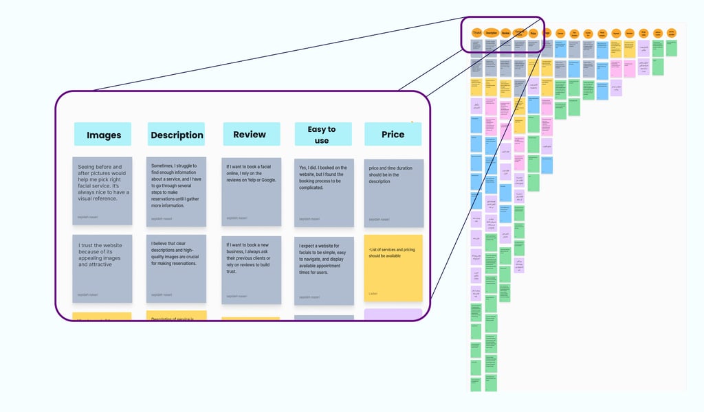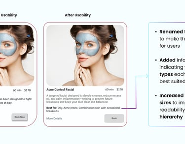 The open card sorting session revealed how users naturally group and label our services. For example, many participants placed facials and peels in the same category, while add-on treatments were often separated. This insight helped me restructure the navigation and service categorization to better align with users’ mental models.