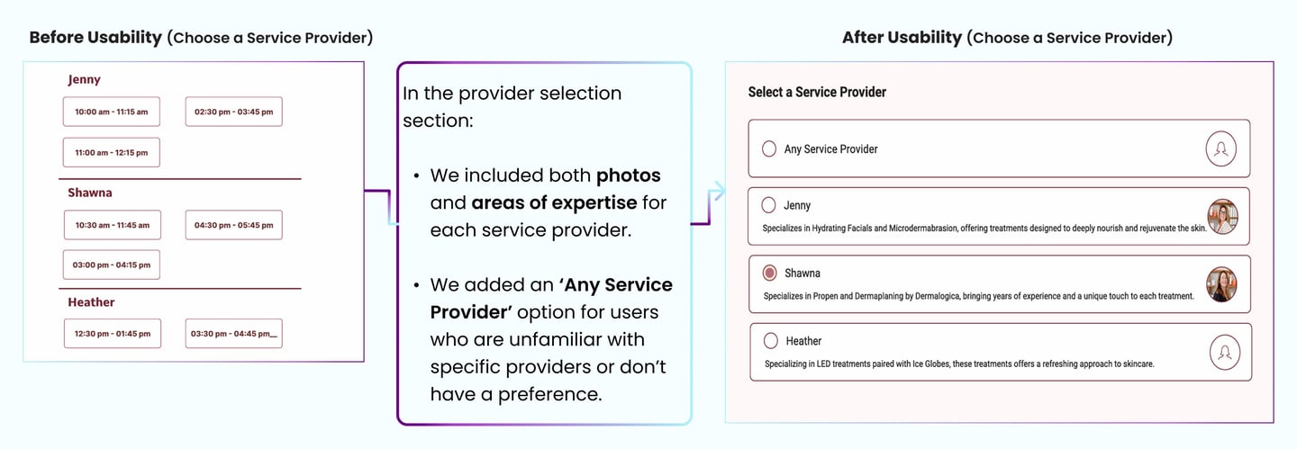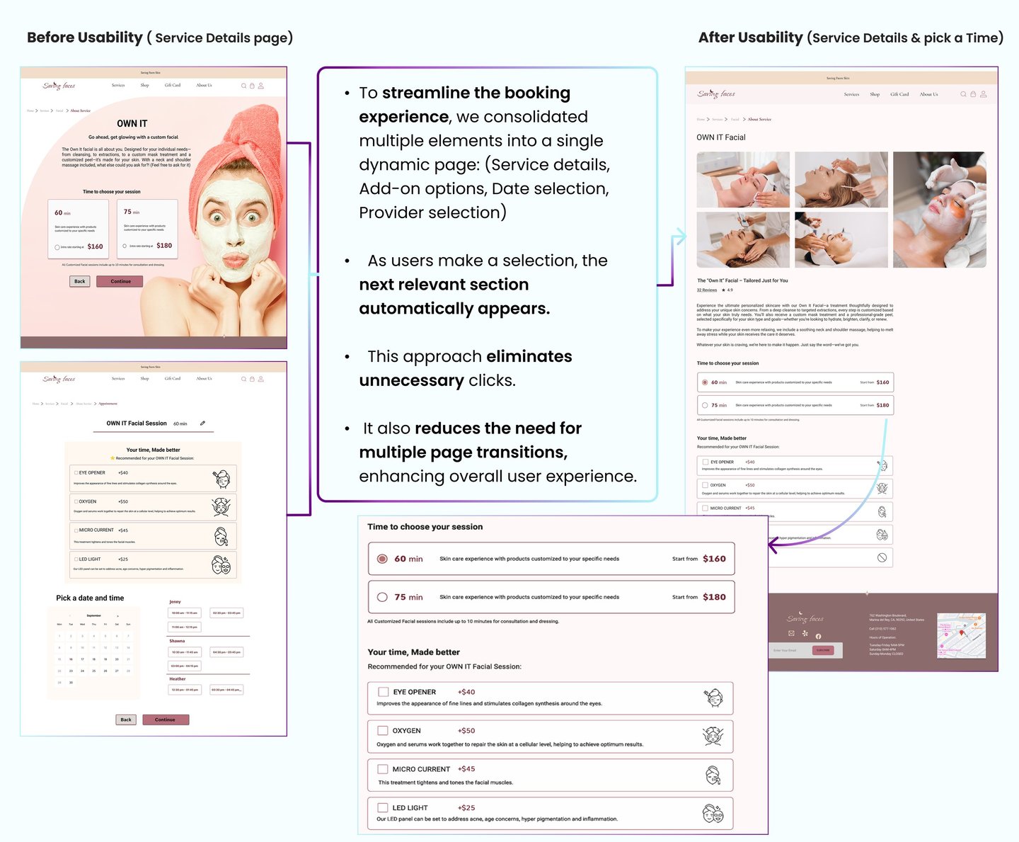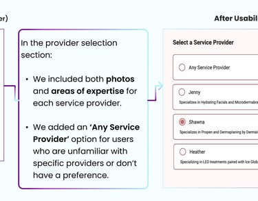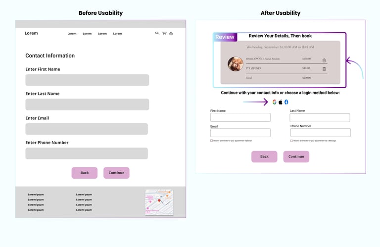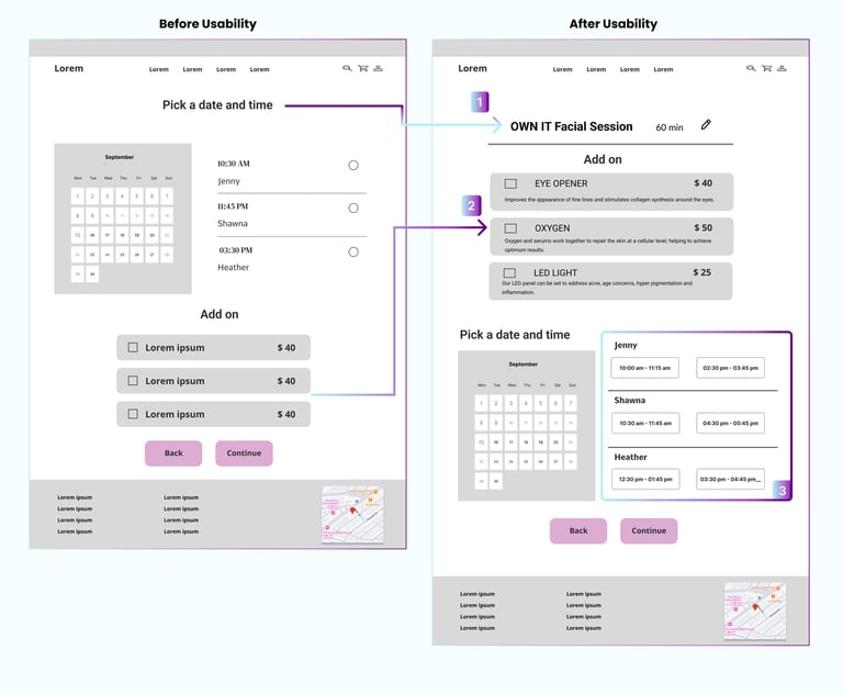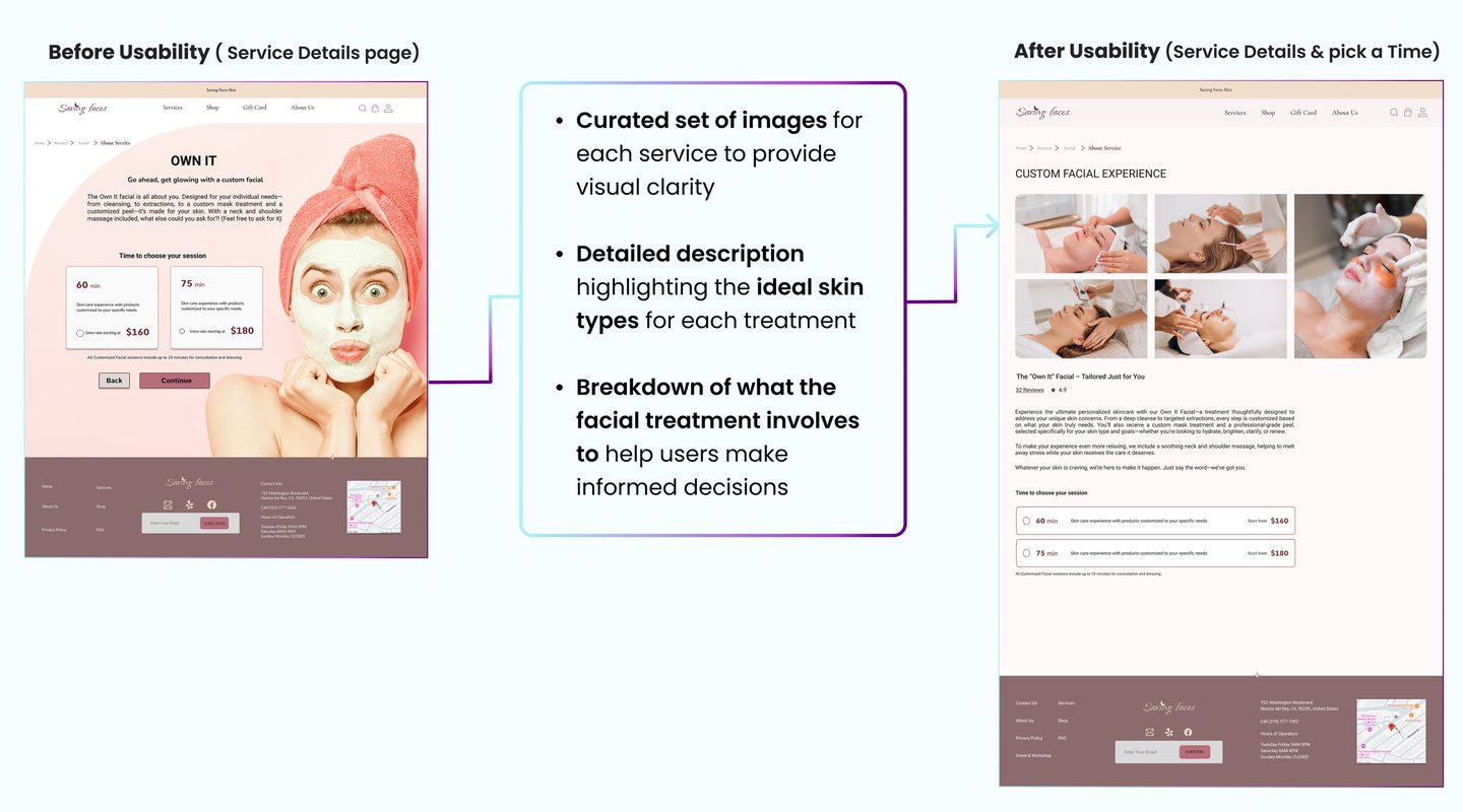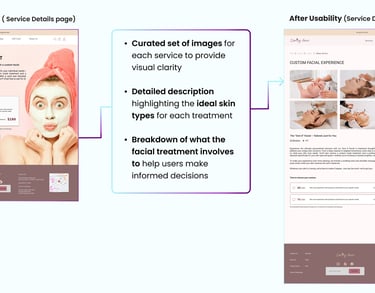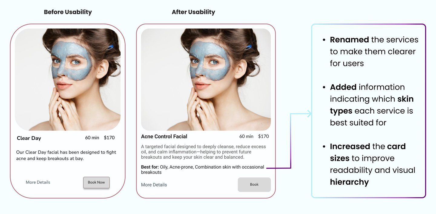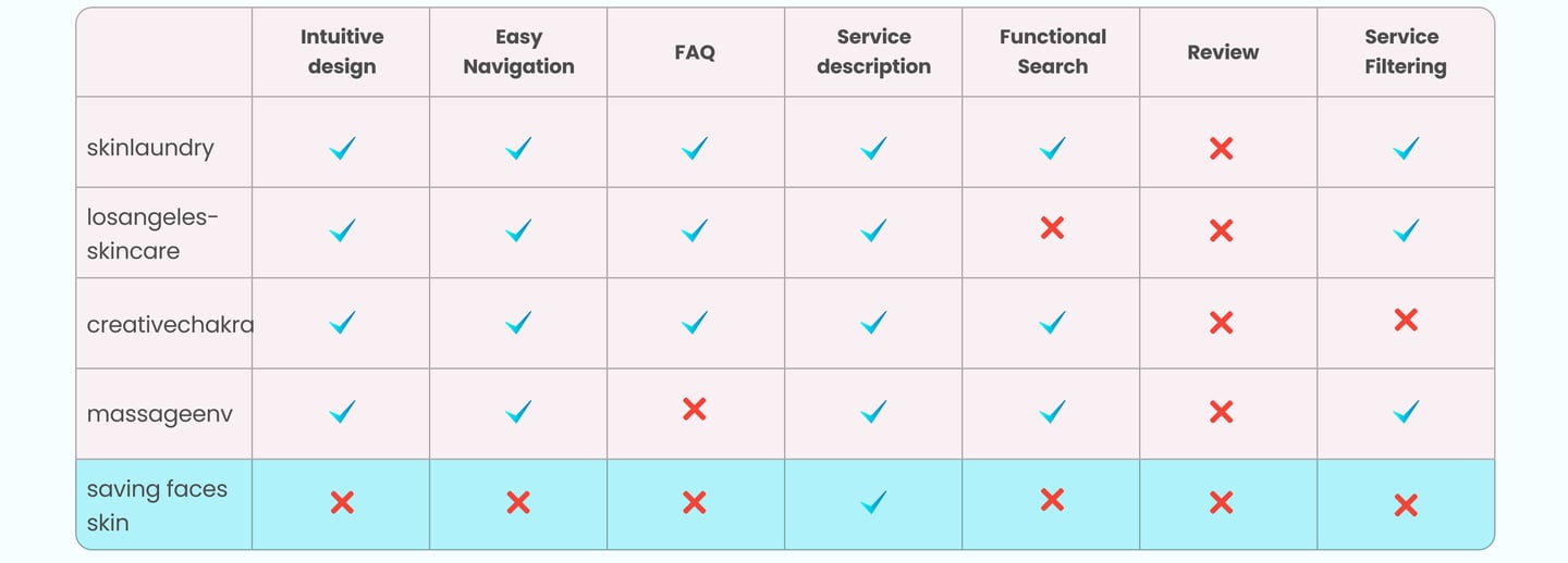After uncovering usability issues through a heuristic evaluation, we conducted a competitive analysis to understand how competitors addressed these challenges on their websites. We reviewed several skincare service websites, focusing on the following key features: