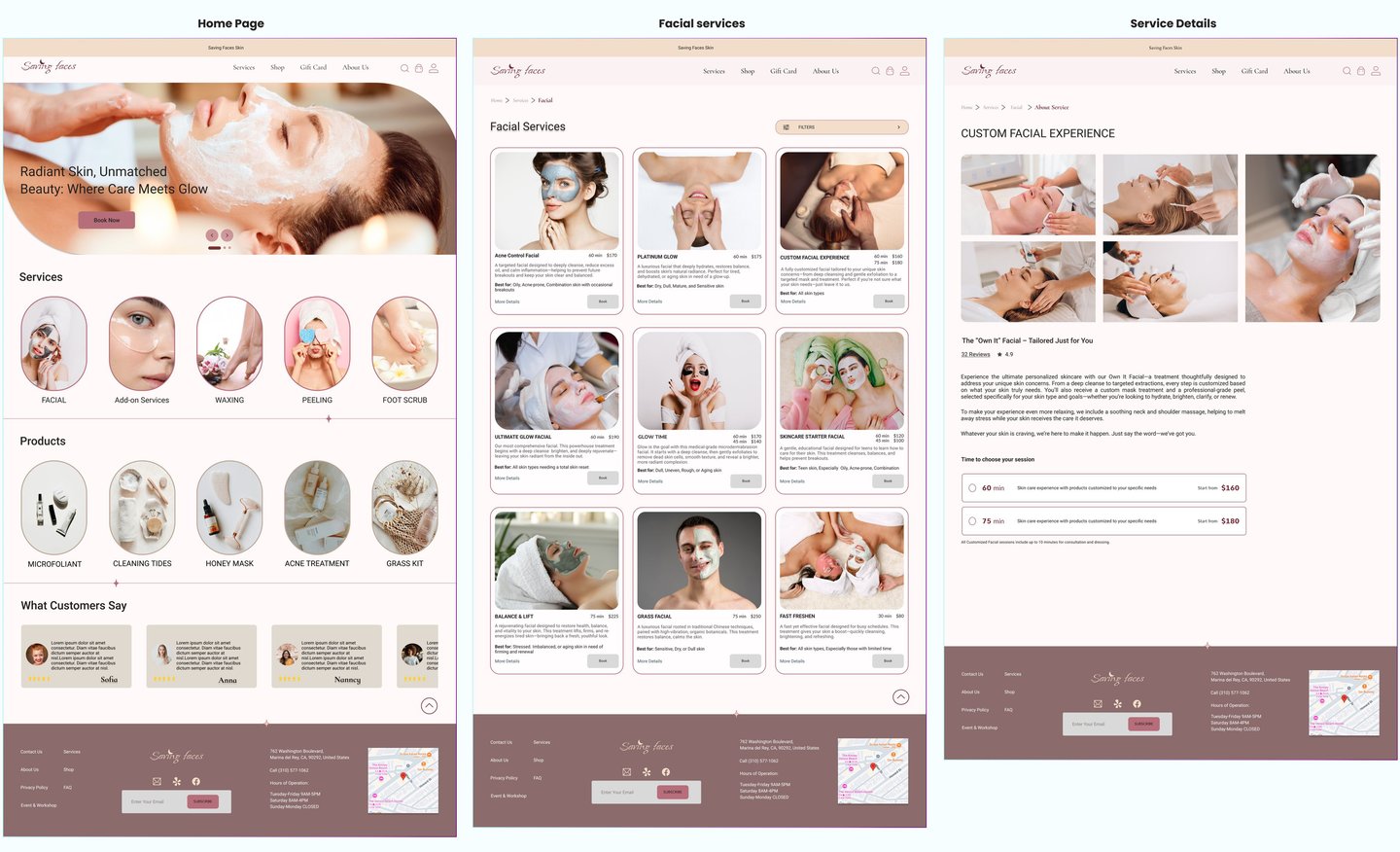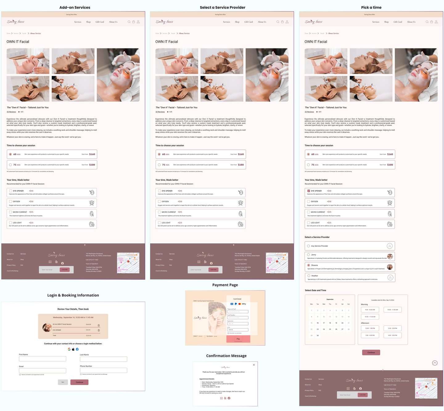 We designed a simple and intuitive user flow to help visitors explore services and book a facial appointment in just a few steps. The experience reflects the brand’s calming, self-care tone while supporting mobile-first usability.
